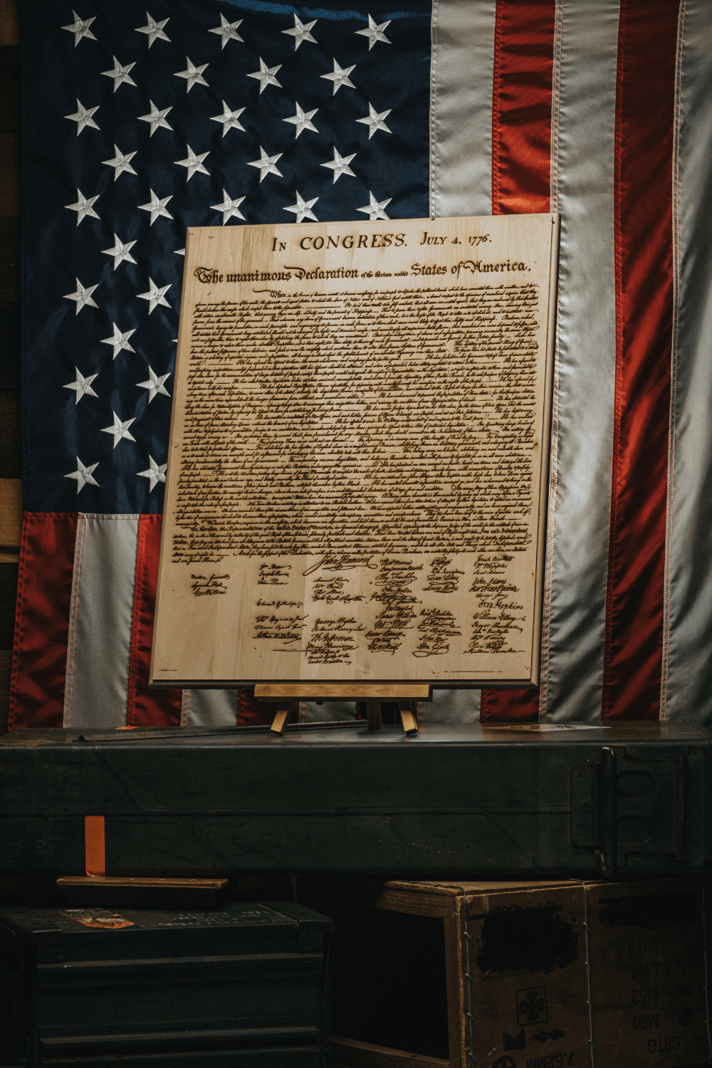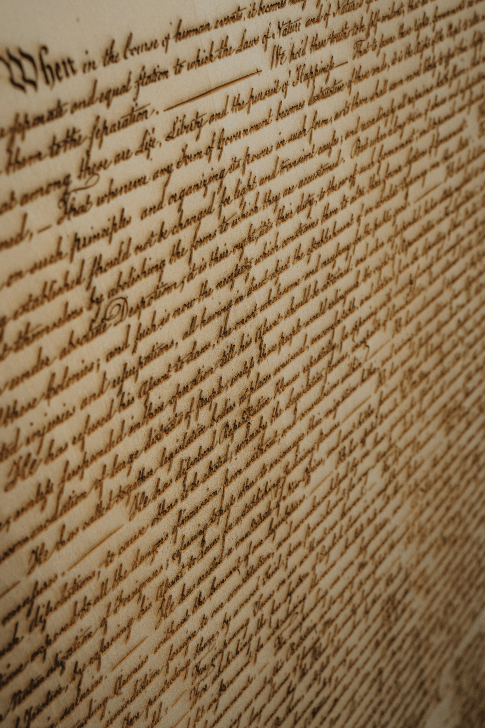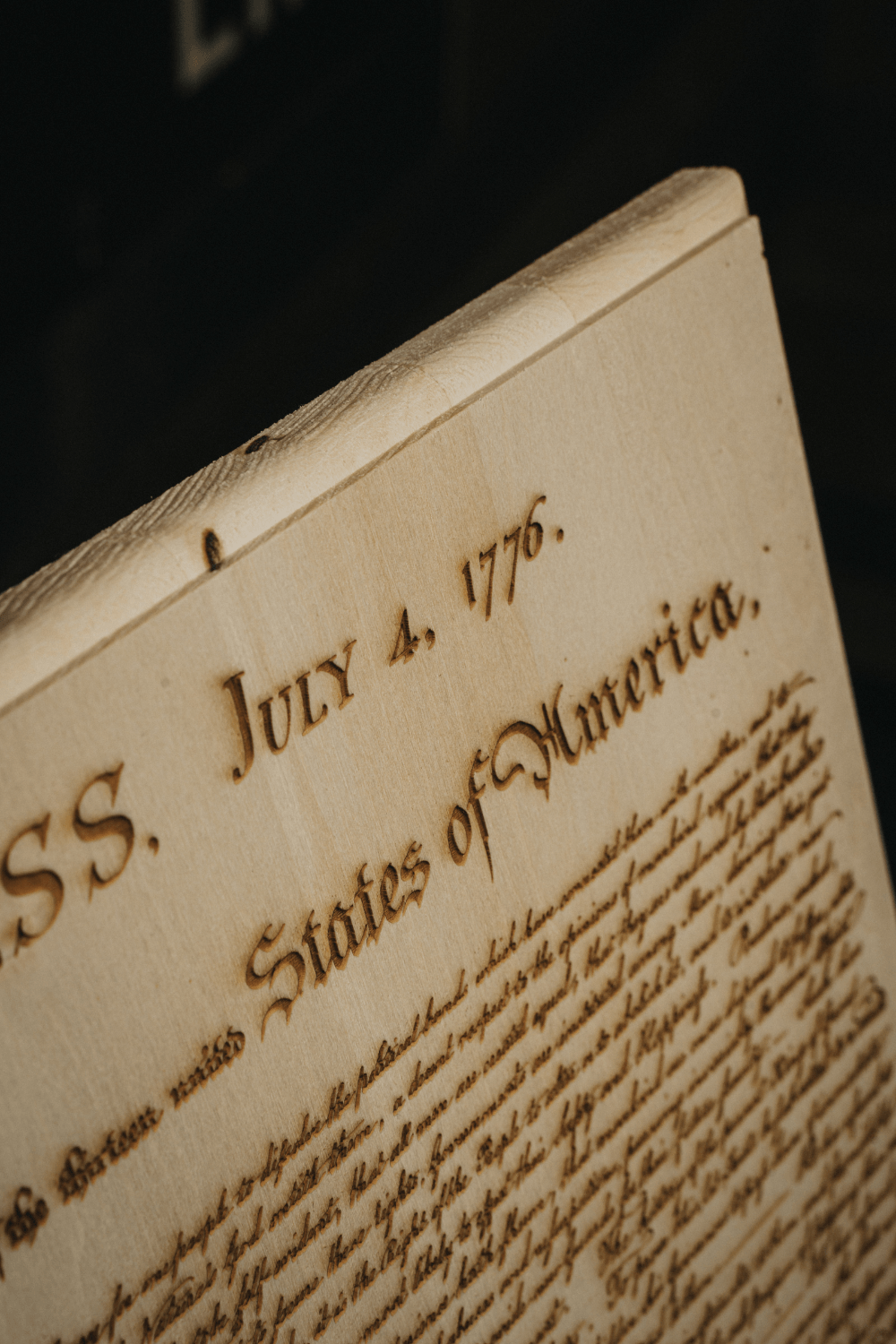 Show off your patriotism with this custom made wooden reproduction of one of our nation's most important documents. Handcrafted from wood and doused in freedom, this Declaration of Independence replica is produced here in America at Nine Line Apparel's Savannah, GA headquarters.